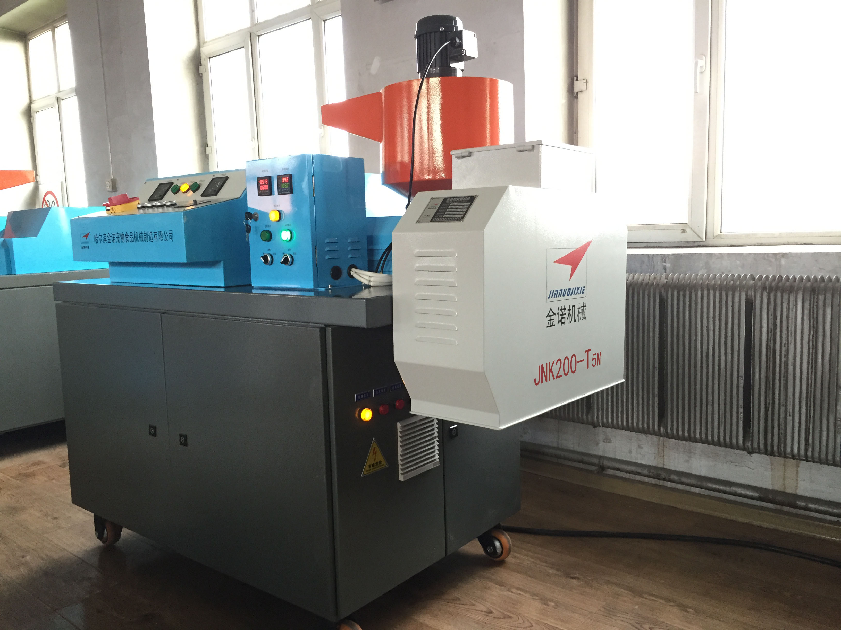 狗糧加工設(shè)備JNK200-T5M:1。JNK200-T5M型狗糧加工設(shè)備安裝方便、出廠已經(jīng)試機(jī),狗糧機(jī)切刀采用直角切刀技術(shù),調(diào)試簡(jiǎn)單;2。狗糧設(shè)備的主軸和切刀小軸均可隨時(shí)注入耐高溫潤(rùn)滑脂,延長(zhǎng)狗糧機(jī)的軸承使用壽命;3。JNK200-T5M狗糧設(shè)備每小時(shí)生產(chǎn)狗糧顆粒200公斤。